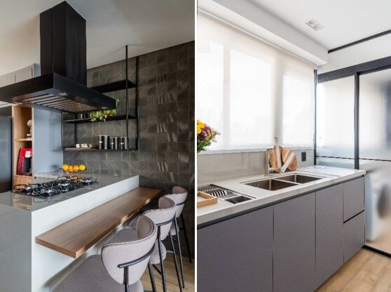 Com a alteração, o ambiente ganhou uma cozinha estilo americano revestida com ladrilhos em tons de cinza escuro e um balcão com cooktop e espaço refeições rápidas efetuado com lâmina sinterizada. Para ampliar a área da cozinha, a profissional precisou reduzir as dimensões da lavanderia que, embora compacta, ganhou um viés ainda mais funcional.