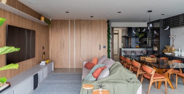 Home GeralCozinha integrada com a área social conduziu projeto de reforma de apartamento com 145m²