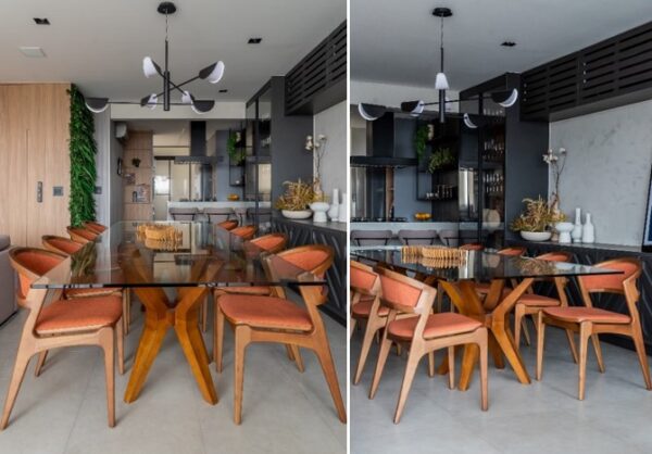 Adjacente à cozinha, a sala de jantar se destaca pela sofisticação da marcenaria, na cor chumbo, que conectou cristaleirabuffet com iluminação interna e adega climatizada. A arquiteta manteve a mesa de vidro já existente e adicionou modernidade com as cadeiras de madeira com estofado e encosto em tom terracota.