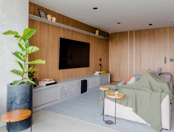 Na sala de estar, a profissional investiu no revestimento amadeirado para formar o painel que faceia a parede da TV, como também mimetiza a porta de entrada, o lavabo e o acesso à ala íntima. “Aproveitamos toda essa extensão para embutir LEDs verticais que complementam o projeto luminotécnico do apartamento”, relata Mari.