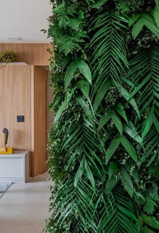 No projeto, a predileção pelas plantas preservadas para a composição do jardim vertical. A decisão atende ao anseio de viver próximo à natureza, mas sem a necessidade dos cuidados requisitados pelas espécies vivas.