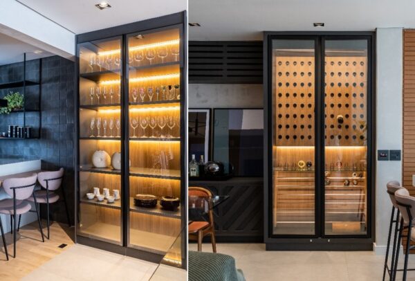 Para turbinar a área social, o casal, que aprecia o bem receber, pode desfrutar da adega climatizada que acolhe os rótulos selecionados por eles. Acompanhada pela cristaleira, ambas foram envolvidas em uma ‘caixa’ de serralheria – material presente em outros pontos do projeto –, e complementadas pelo interior de madeira, a iluminação de fitas de LED e as portas de vidro.