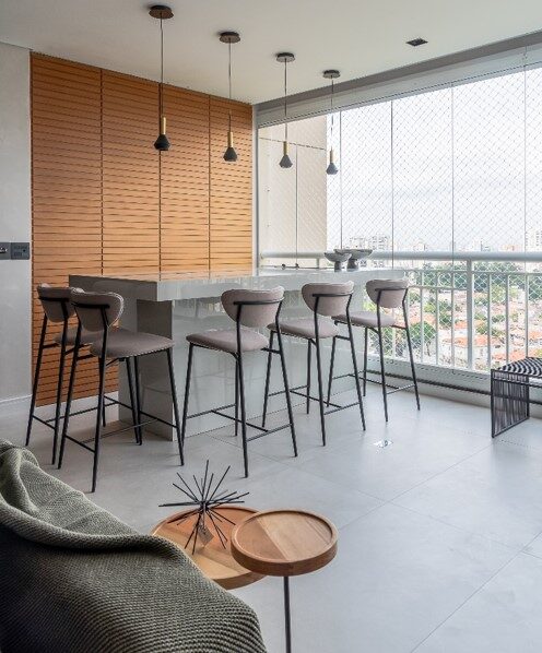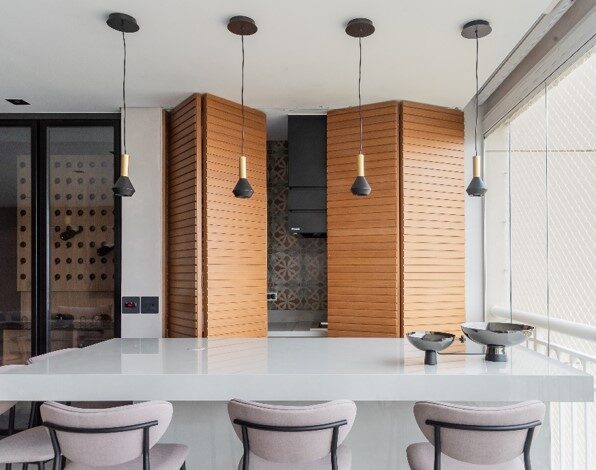 Com o fechamento da porta sanfonada, as lâminas criaram um painel ripado que bloqueia a visão da churrasqueira e libera espaço para circulação na varanda
