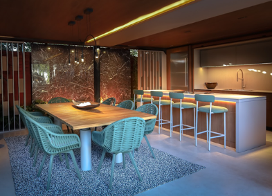 O ambiente gourmet também conta com a Série Rosso Lepanto, inspirada no raro mármore turco de fundo vermelho cereja e veios brancos. Nas dimensões de 120 x 250 cm, o porcelanato se evidencia por seu brilho intenso.
