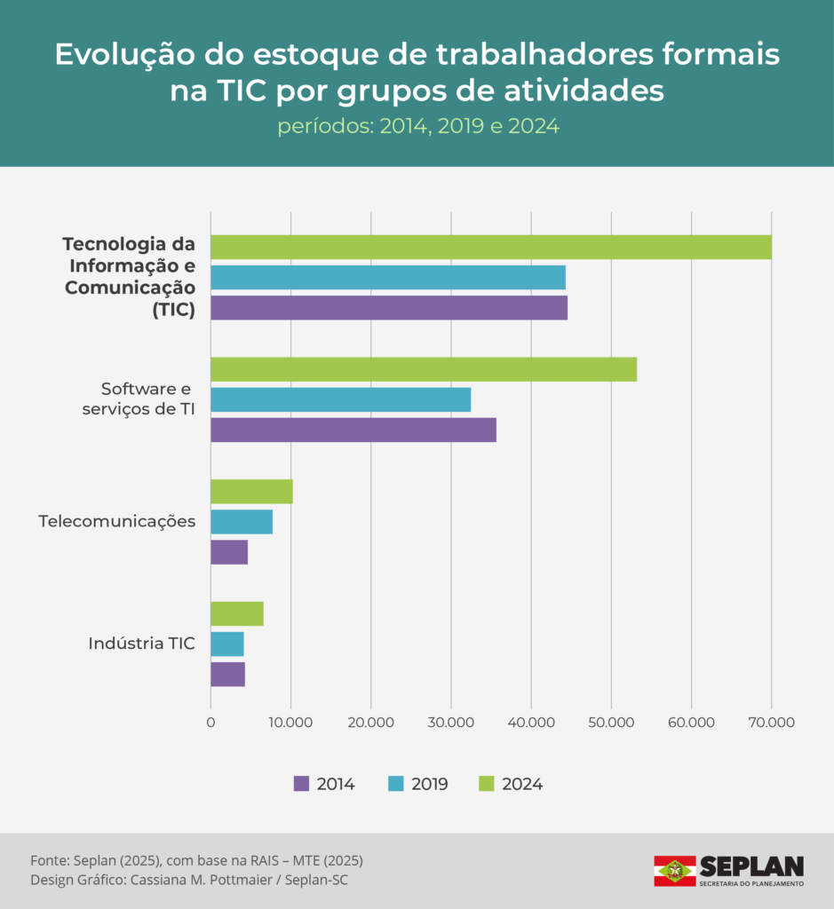 O levantamento faz parte da nova edição do Informativo Mensal do Emprego, divulgado pela Secretaria de Estado do Planejamento (Seplan), que reúne informações do Novo Caged, RAIS e outros indicadores setoriais. Para efeito de comparação, o crescimento do emprego formal total em Santa Catarina foi de apenas 11,9% no mesmo período, evidenciando a velocidade de expansão do setor TIC.