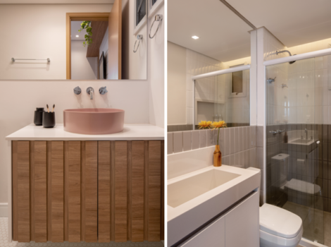 O banheiro foi outro destaque do projeto, com a adição de uma cuba rosa, que traz um ponto de cor discreto, mas marcante, sem destoar da proposta clean. Além disso, o segundo quarto, planejado para os pais da moradora, adota tons suaves de verde, criando um ambiente sereno e acolhedor.